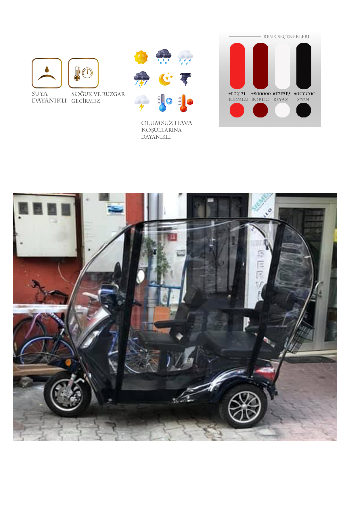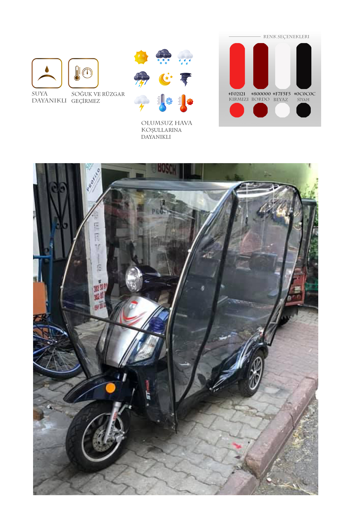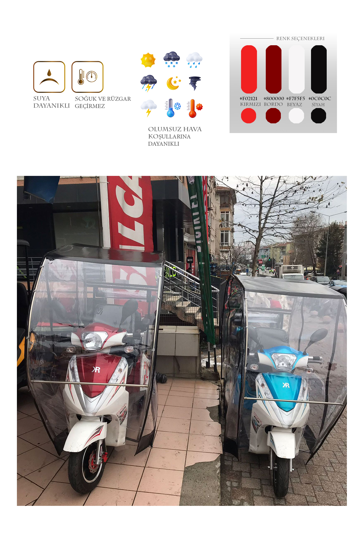 Kr Vesta 5000 model için üretilen bu branda kabin ile motorunuzu ve kendinizi yağmur, kar, rüzgar gibi dış etkenlerden koruyabilirsiniz. Kurulumu kolay ve demonte bir üründür. Geçme sistem alüminyum kasadan oluşur. Tamamen kuruluma hazır olarak tüm aksesuarları ile gönderilir. 1. sınıf şeffaf Almanyadan ithal branda kullanılmıştır. Kesinlikle yağmur geçirmez ve suya dayanıklıdır. Fermuarları kemik diş olarak tabir edilen piyasadaki en kaliteli fermuardır. Şeffaf brandası su turmaz özelliktedir ve görüş açısını olumsuz etkilemez. Yedek parçaları firmamızda mevcuttur. Yağmurlu ve soğuk kış günlerinde motorunuzu korur ve kışın kullanılamayan aracınızı kullanılabilir kılar. Fermuarlı kapı sistemi sayesinde sıcak havalarda katlanabilme özelliği sayesinde katlayarak yine aktif bir şekilde kullanabilirsiniz.