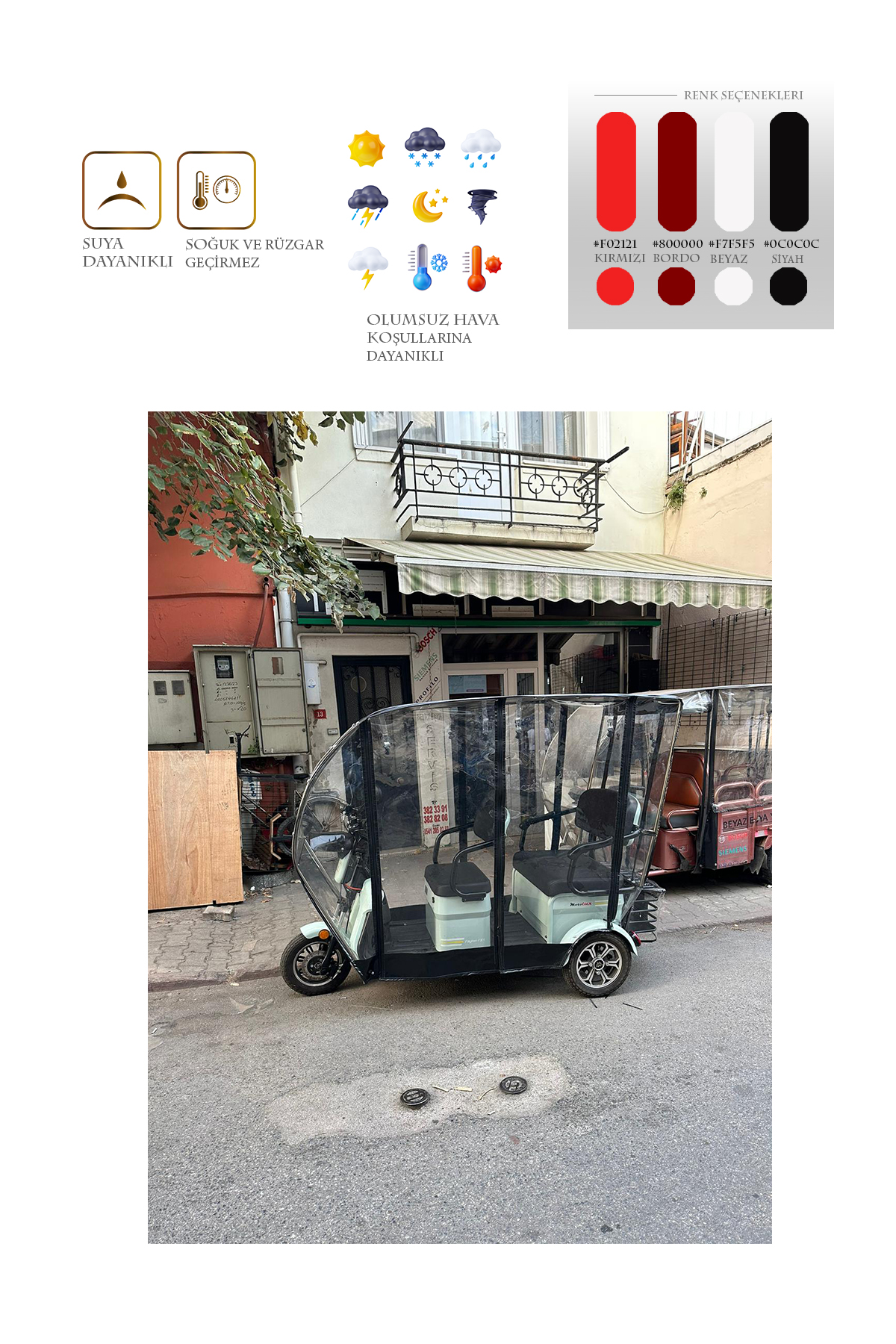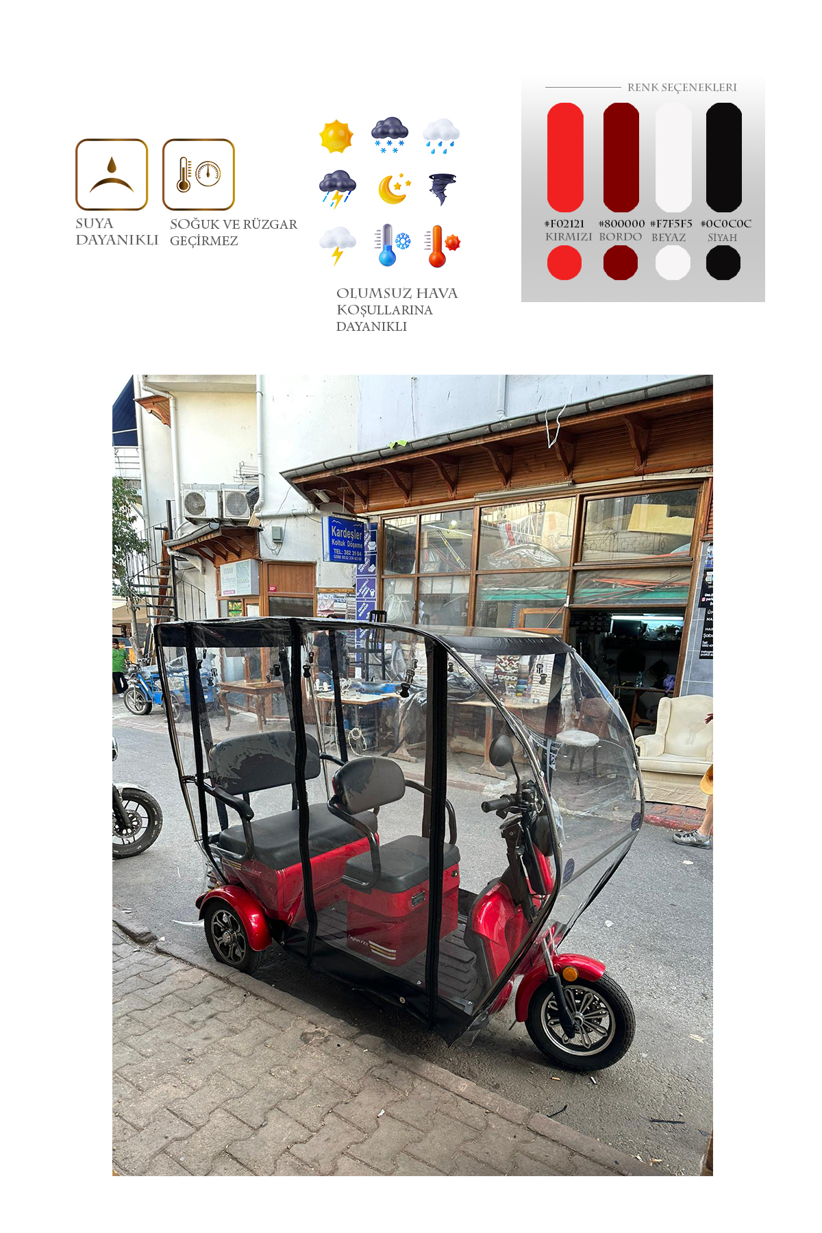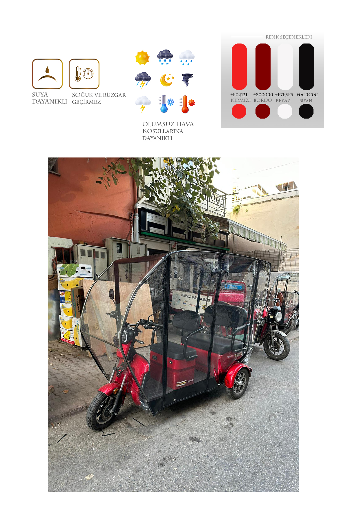 motolüx fx11 model için üretilen bu branda kabin ile motorunuzu ve kendinizi yağmur, kar, rüzgar gibi dış etkenlerden koruyabilirsiniz. Kurulumu kolay ve demonte bir üründür. Geçme sistem alüminyum kasadan oluşur. Tamamen kuruluma hazır olarak tüm aksesuarları ile gönderilir. 1. sınıf şeffaf Almanyadan ithal branda kullanılmıştır. Kesinlikle yağmur geçirmez ve suya dayanıklıdır. Fermuarları kemik diş olarak tabir edilen piyasadaki en kaliteli fermuardır. Şeffaf brandası su turmaz özelliktedir ve görüş açısını olumsuz etkilemez. Yedek parçaları firmamızda mevcuttur. Yağmurlu ve soğuk kış günlerinde motorunuzu korur ve kışın kullanılamayan aracınızı kullanılabilir kılar. Fermuarlı kapı sistemi sayesinde sıcak havalarda katlanabilme özelliği sayesinde katlayarak yine aktif bir şekilde kullanabilirsiniz.