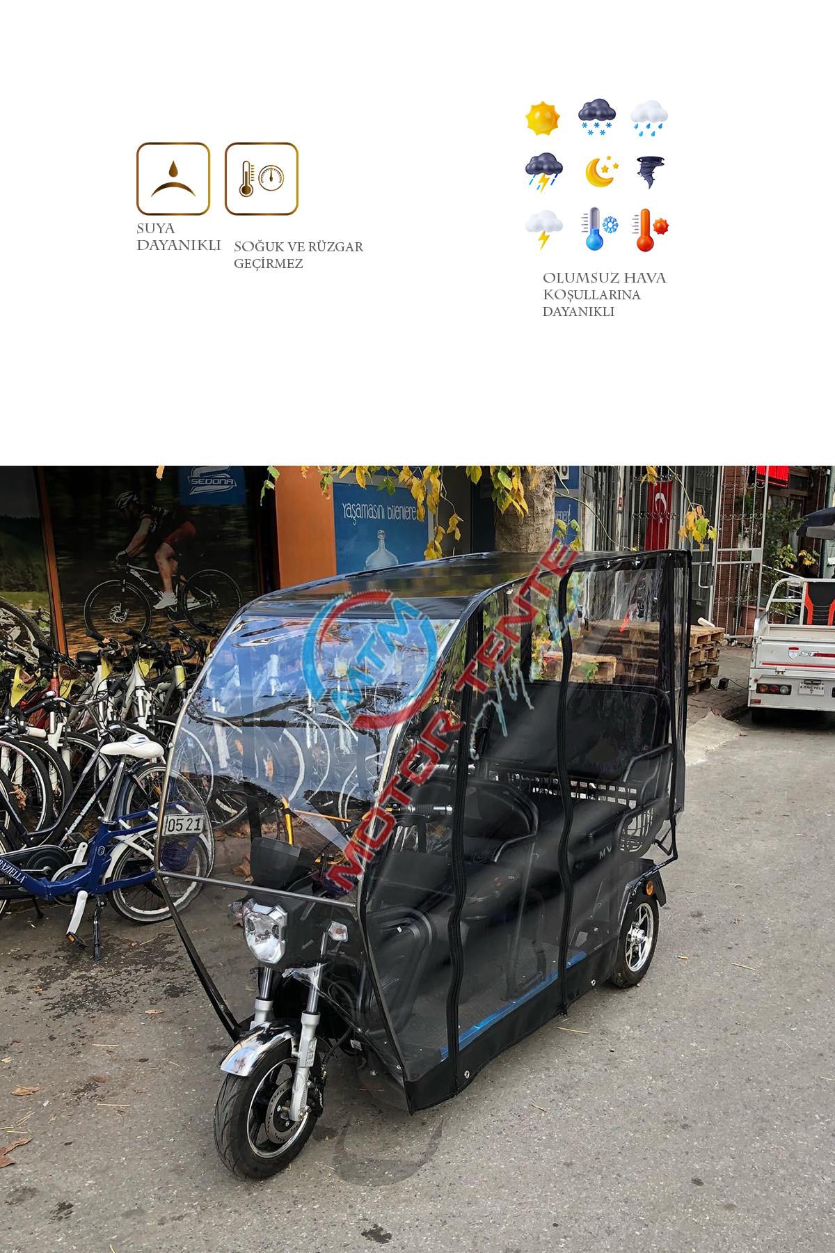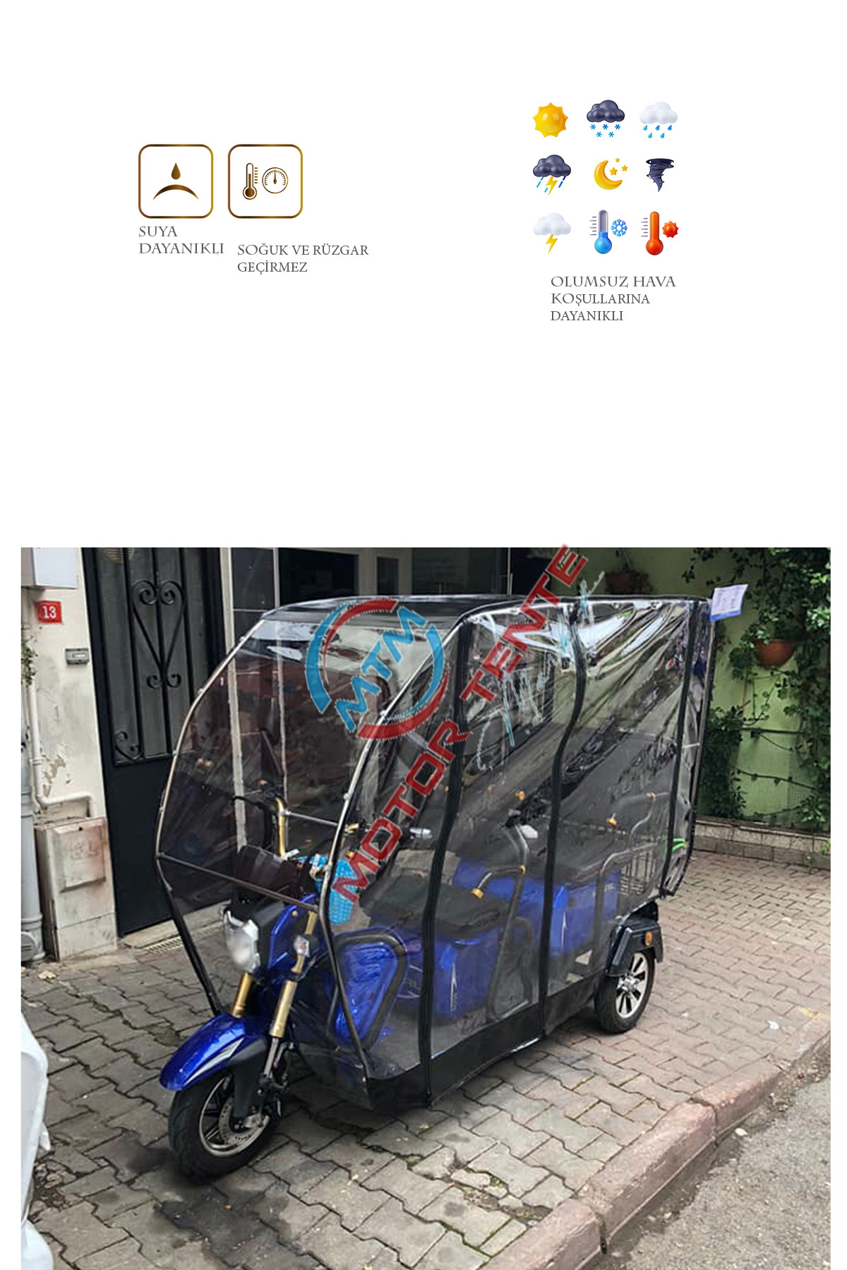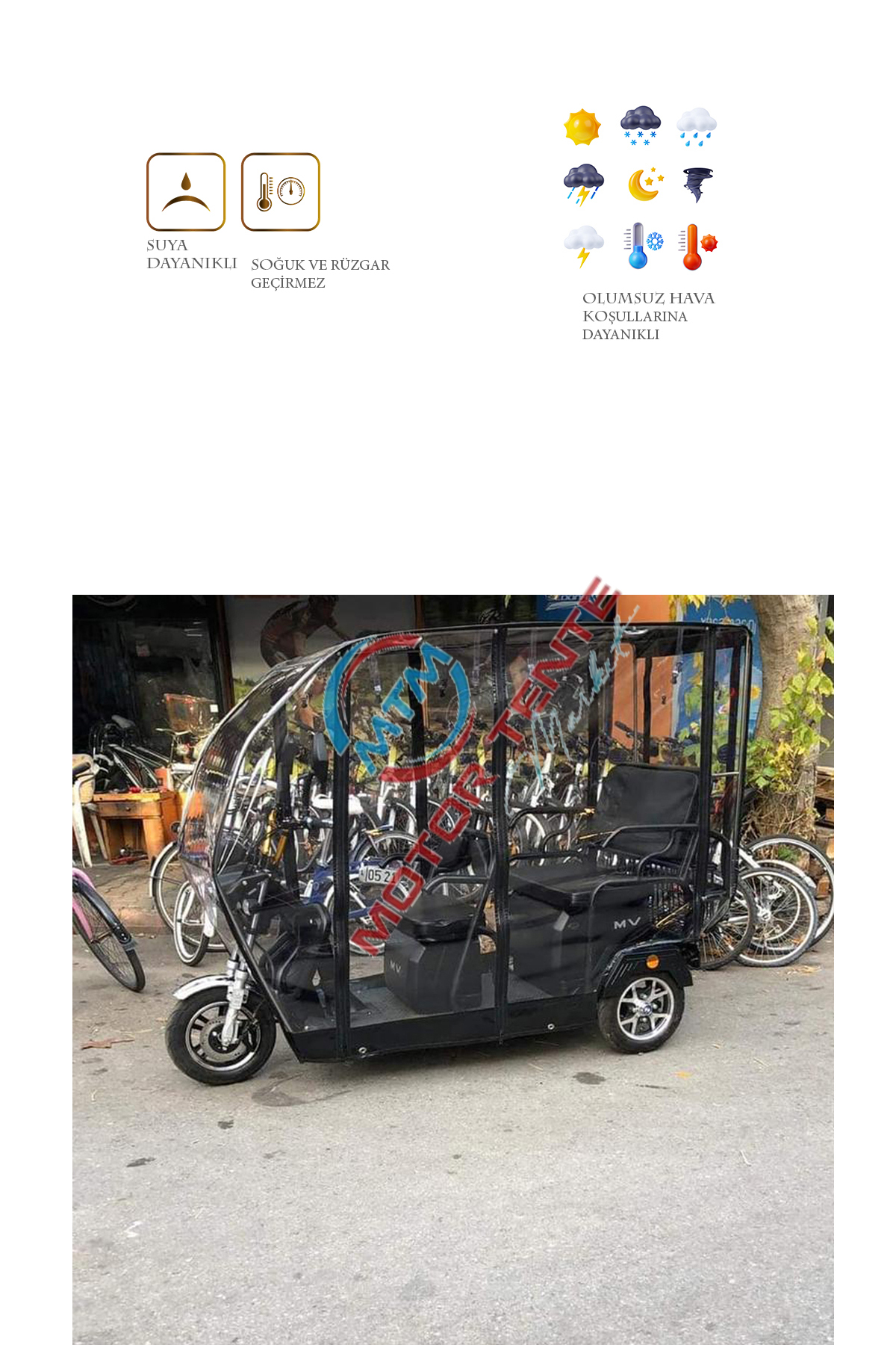 Volta VM5 model için üretilen bu branda kabin ile motorunuzu ve kendinizi yağmur, kar, rüzgar gibi dış etkenlerden koruyabilirsiniz. Kurulumu kolay ve demonte bir üründür. Geçme sistem alüminyum kasadan oluşur. Tamamen kuruluma hazır olarak tüm aksesuarları ile gönderilir. 1. sınıf şeffaf Almanyadan ithal branda kullanılmıştır. Kesinlikle yağmur geçirmez ve suya dayanıklıdır. Fermuarları kemik diş olarak tabir edilen piyasadaki en kaliteli fermuardır. Şeffaf brandası su turmaz özelliktedir ve görüş açısını olumsuz etkilemez. Yedek parçaları firmamızda mevcuttur. Yağmurlu ve soğuk kış günlerinde motorunuzu korur ve kışın kullanılamayan aracınızı kullanılabilir kılar. Fermuarlı kapı sistemi ile sıcak havalarda katlanabilme özelliği sayesinde katlayarak yine aktif bir şekilde kullanabilirsiniz.