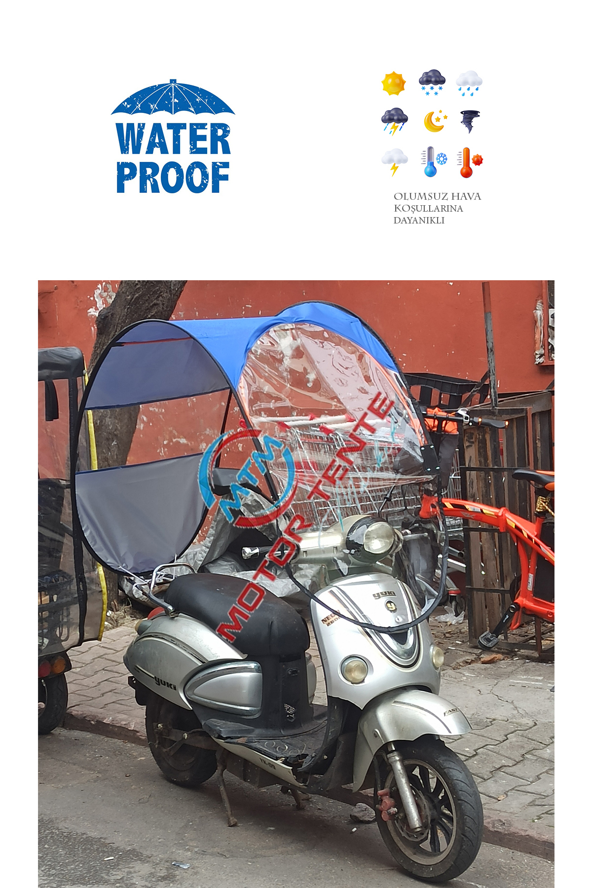 İki tekerli motosiklet ve scooter için üretilen tenteürünümüz sayesinde yağmur, dolu, kar, çamur, toz, taş sıçraması, güneş yanığıgibi olumsuz etkilerden korunabilirsiniz. Ürünümüz şeffaf branda veparaşüt kumaş ile üretilmiştir. Birinci kalite branda, kumaş ve aksesuarlarkullanılarak hazırlanmıştır. Hemen her türlü scooter ve motosikletle uyumluolan tentemizi yağmurlu ve soğuk havalarda rahatlıkla kullanabilirsiniz.Montajı ayna kısmından yapılmaktadır ve çok basittir. Kurulum şeması ürün paketiçeriğimizde tarafınıza iletilecektir. Aynı şekilde kullanılmayacağı zamankolayca sökülerek çıkartılabilir. Esnek yapısı sayesinderüzgarlı havalarda rahatlıkla kullanabilirsiniz. Moto kurye olarak çalışanmüşterilerimiz için çok avantaj sağlayacak bir tentedir. Bu tente iki tekerli motor vescooterlar için üretilmiş olup yağmur, kar ve fırtınalı havalarda sürücünün mecburikorunmasını sağlamak için yardımcı bir aksesuar olarak üretilmiştir. Yüksekhız, kaygan zemin ve fırtına durumlarında