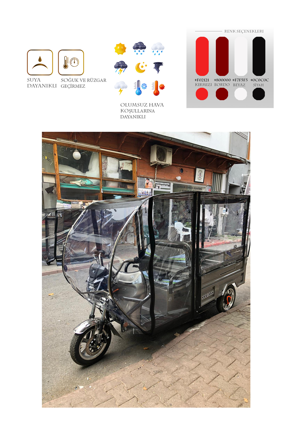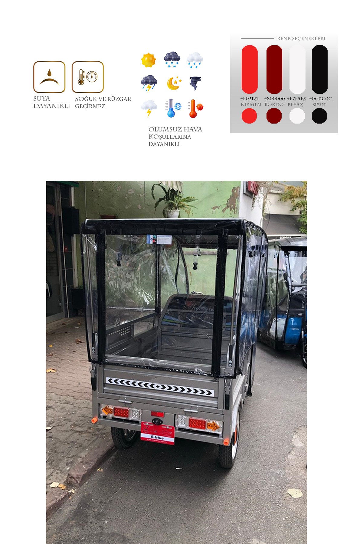 Arora Navara New XLT48A model için üretilen bu branda kabin ile motorunuzu ve kendinizi yağmur, kar, rüzgar gibi dış etkenlerden koruyabilirsiniz. Kurulumu kolay ve demonte bir üründür. Geçme sistem alüminyum kasadan oluşur. Tamamen kuruluma hazır olarak tüm aksesuarları ile gönderilir. 1. sınıf şeffaf Almanyadan ithal branda kullanılmıştır. Kesinlikle yağmur geçirmez ve suya dayanıklıdır. Fermuarları kemik diş olarak tabir edilen piyasadaki en kaliteli fermuardır. Şeffaf brandası su turmaz özelliktedir ve görüş açısını olumsuz etkilemez. Yedek parçaları firmamızda mevcuttur. Yağmurlu ve soğuk kış günlerinde motorunuzu korur ve kışın kullanılamayan aracınızı kullanılabilir kılar. Fermuarlı kapı sistemi sayesinde sıcak havalarda katlanabilme özelliği sayesinde katlayarak yine aktif bir şekilde kullanabilirsiniz. Ürünümüz siyah brandadır.