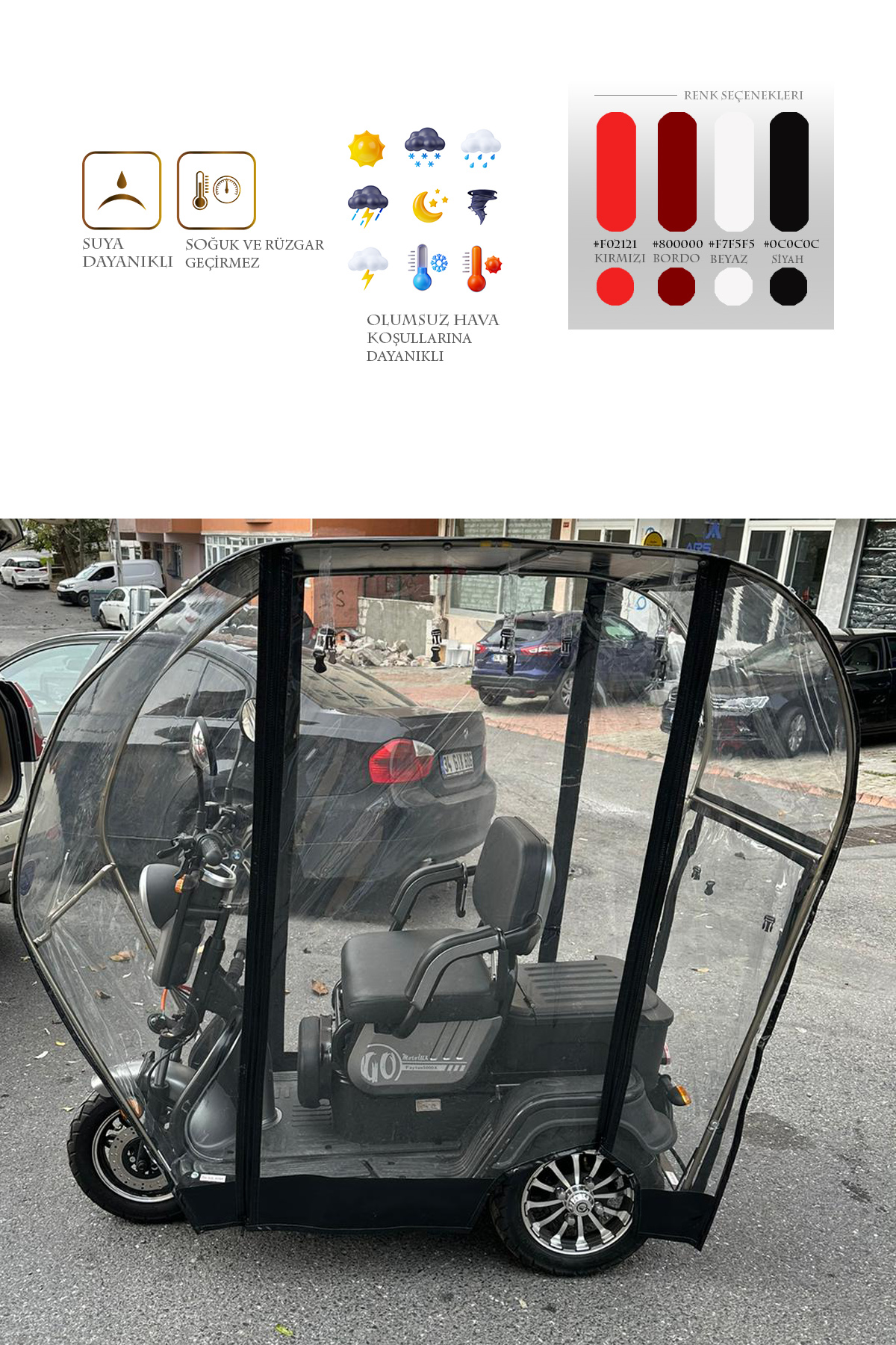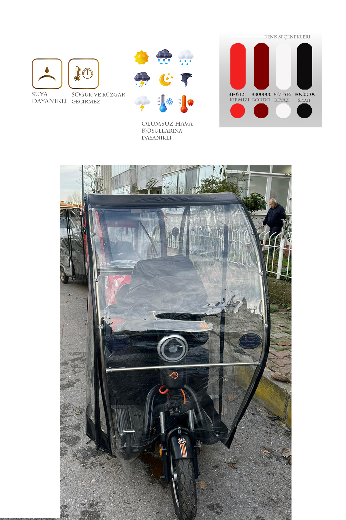 Motolux Fayton 5000x model için üretilen bu branda kabin ile motorunuzu ve kendinizi yağmur, kar, rüzgar gibi dış etkenlerden koruyabilirsiniz. Kurulumu kolay ve demonte bir üründür. Geçme sistem alüminyum kasadan oluşur. Tamamen kuruluma hazır olarak tüm aksesuarları ile gönderilir. 1. sınıf şeffaf Almanyadan ithal branda kullanılmıştır. Kesinlikle yağmur geçirmez ve suya dayanıklıdır. Fermuarları kemik diş olarak tabir edilen piyasadaki en kaliteli fermuardır. Şeffaf brandası su turmaz özelliktedir ve görüş açısını olumsuz etkilemez. Yedek parçaları firmamızda mevcuttur. Yağmurlu ve soğuk kış günlerinde motorunuzu korur ve kışın kullanılamayan aracınızı kullanılabilir kılar. Fermuarlı kapı sistemi sayesinde sıcak havalarda katlanabilme özelliği sayesinde katlayarak yine aktif bir şekilde kullanabilirsiniz. Ürünümüz Siyah renk brandadır.